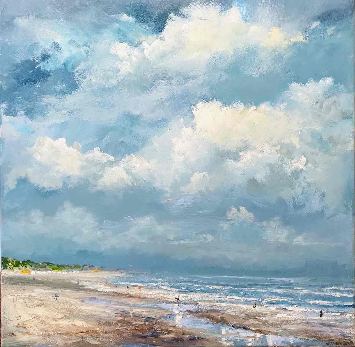 Het strand bij Vrouwenpolder na een hele warme dag. Uit het westen komen buien aan en de dreiging zorgt voor een prachtige kleurenspectakel. Op het strand zijn suggestieve mensen, wandelaars en zonaanbidders te zien met enkele kitesurfers.