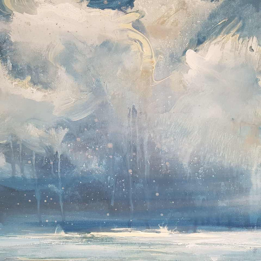 The atmosphere on the canvas is cold and gloomy, as only a cold winter day can be. Snowflakes swirl down from the gray sky and cover the beach with a soft layer of snow. The wind is strong and the sea is unsettled. In the distance, hardly anything can be seen.