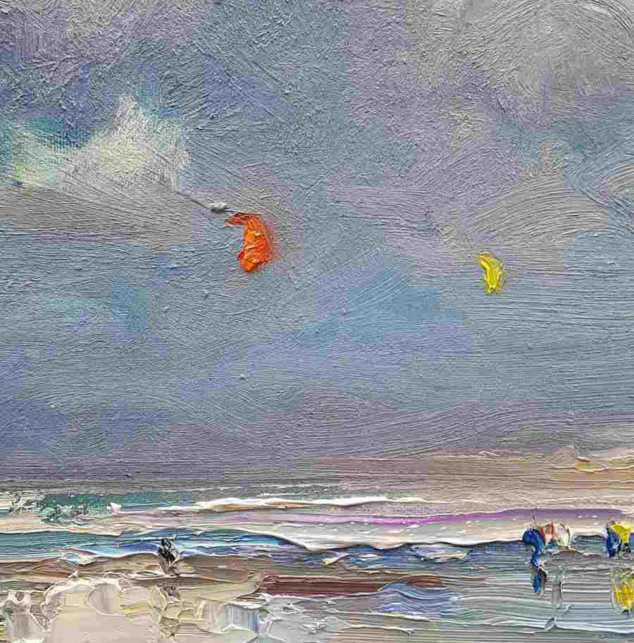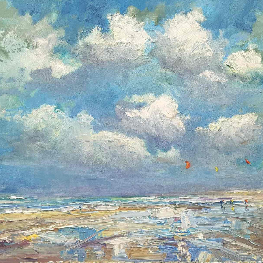 Introducing the North Sea series #82, a stunning piece of artwork that captures the true essence of Zandvoort aan Zee. Featuring reflections on the beach, this painting perfectly depicts a cloudy day with kite surfers and hikers. While it may not be the ideal weather for sunbathing, occasional drizzles and beautiful clouds make for a picturesque scene. The wind picks up, and the kitesurfers take full advantage, adding even more excitement to the already lively setting. Painted with smooth strokes and thick layers of paint, this piece is a true masterpiece that will add a touch of beauty to any home or office.